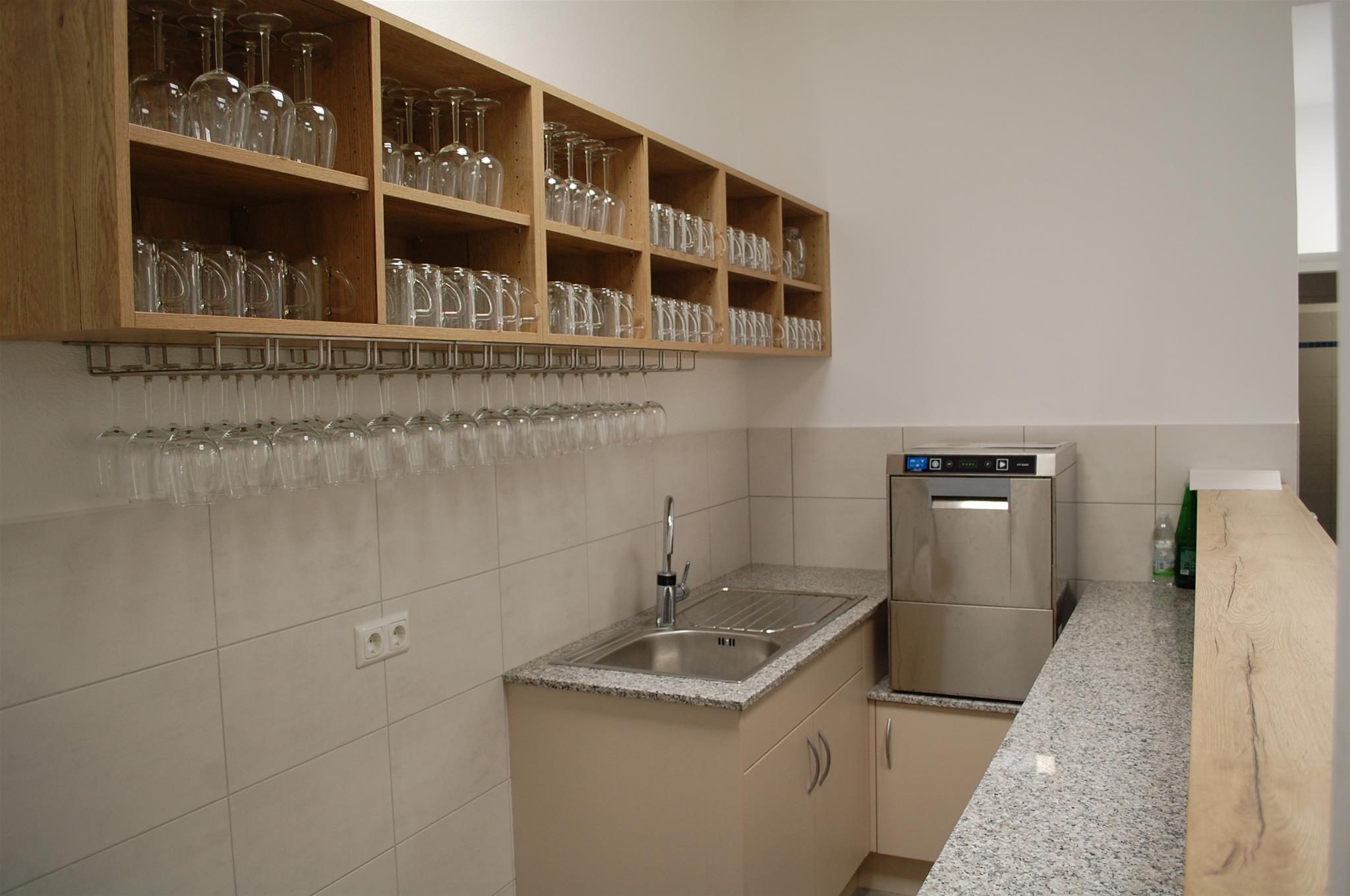 Der Saal ist mit einer modernen Weinbar inklusive Schank ausgestattet.