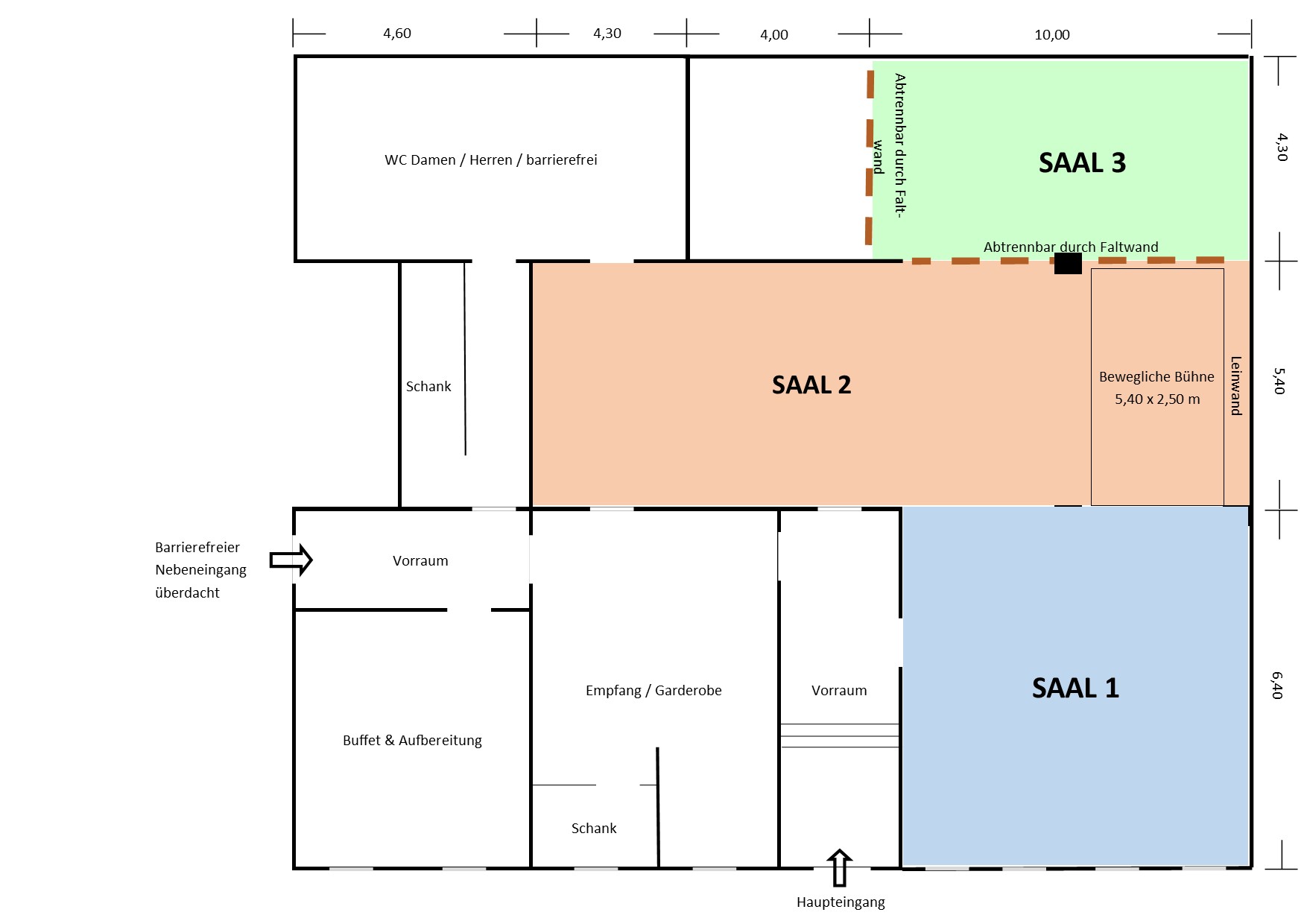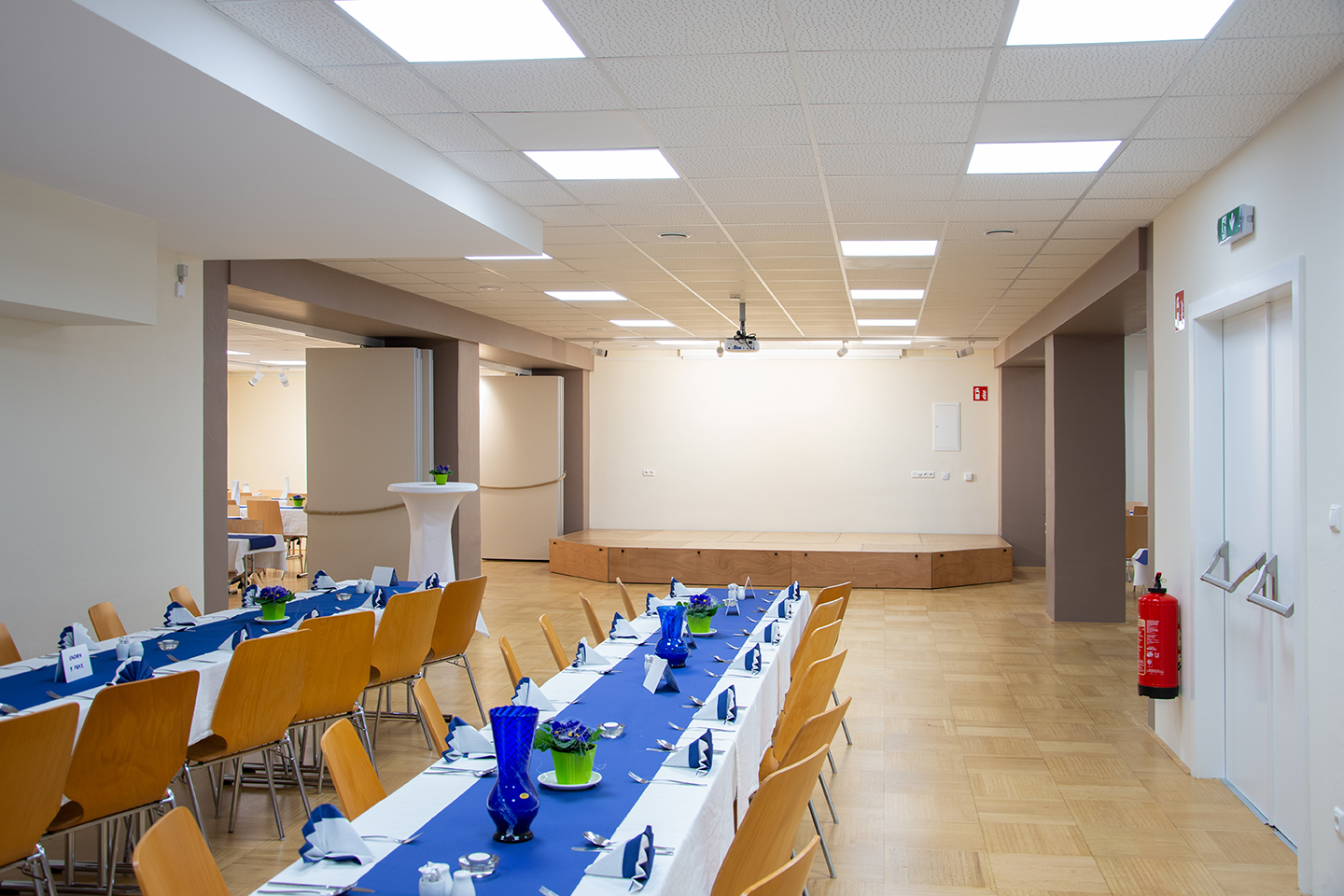Der Saal kann durch eine Trennwand für verschiedene Veranstaltungen wie Konzerte, Bälle, private Feierlichkeiten (Geburtstage, Hochzeiten, Taufen etc.), Vorträge, Seminare und vielem mehr entsprechend abgeteilt und gestaltet werden.