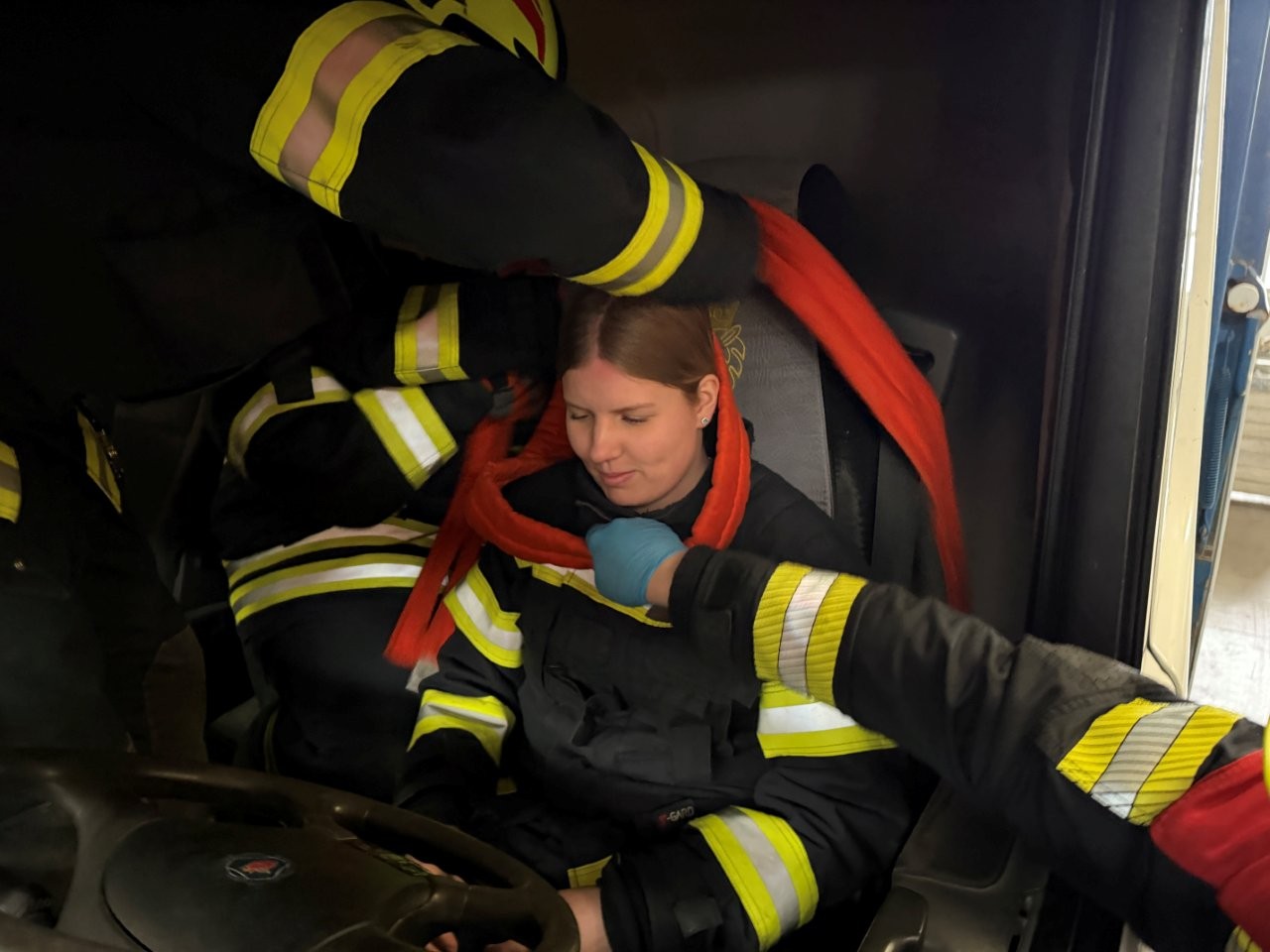 Im weiteren Verlauf lag der Fokus auf der Anwendung hydraulischer und akkubetriebener Rettungsgeräte. Ziel war es, unter realitätsnahen Bedingungen einen sicheren und effizienten Zugang zu verunfallten Personen zu schaffen. Durch das Arbeiten an mehreren Übungsfahrzeugen konnten die Teilnehmer ihre praktischen Fähigkeiten gezielt vertiefen. Zusätzlich wurde die Menschenrettung aus einem LKW unter Einsatz einer Rettungsplattformen geübt.